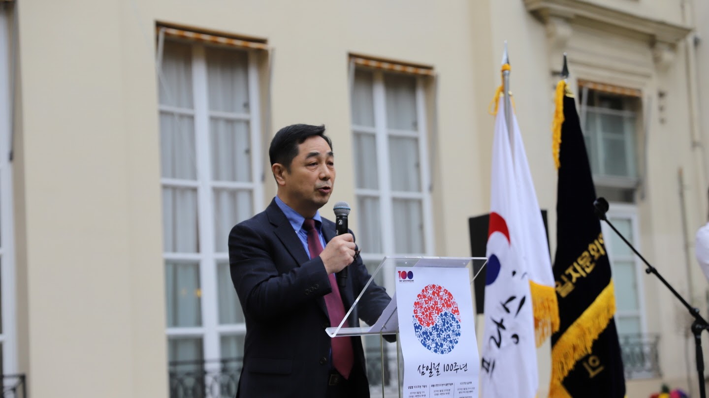 지금의 대사관격인 임시정부 파리위원부의 창립 100주년을 맞아, 어엿한 독립국가이자 세계 10대 강국으로 부상한 오늘날의 대한민국 대사관에서, 유럽에서는 최초 결성된 한인회, 재법한국민회가 100주년을 맞는 그 해에 , 그 후손들이 함께 모여 100주년 3·1절 기념식을 갖는다는 것은, 참으로 가슴 벅찬 일이 아닐 수 없습니다.