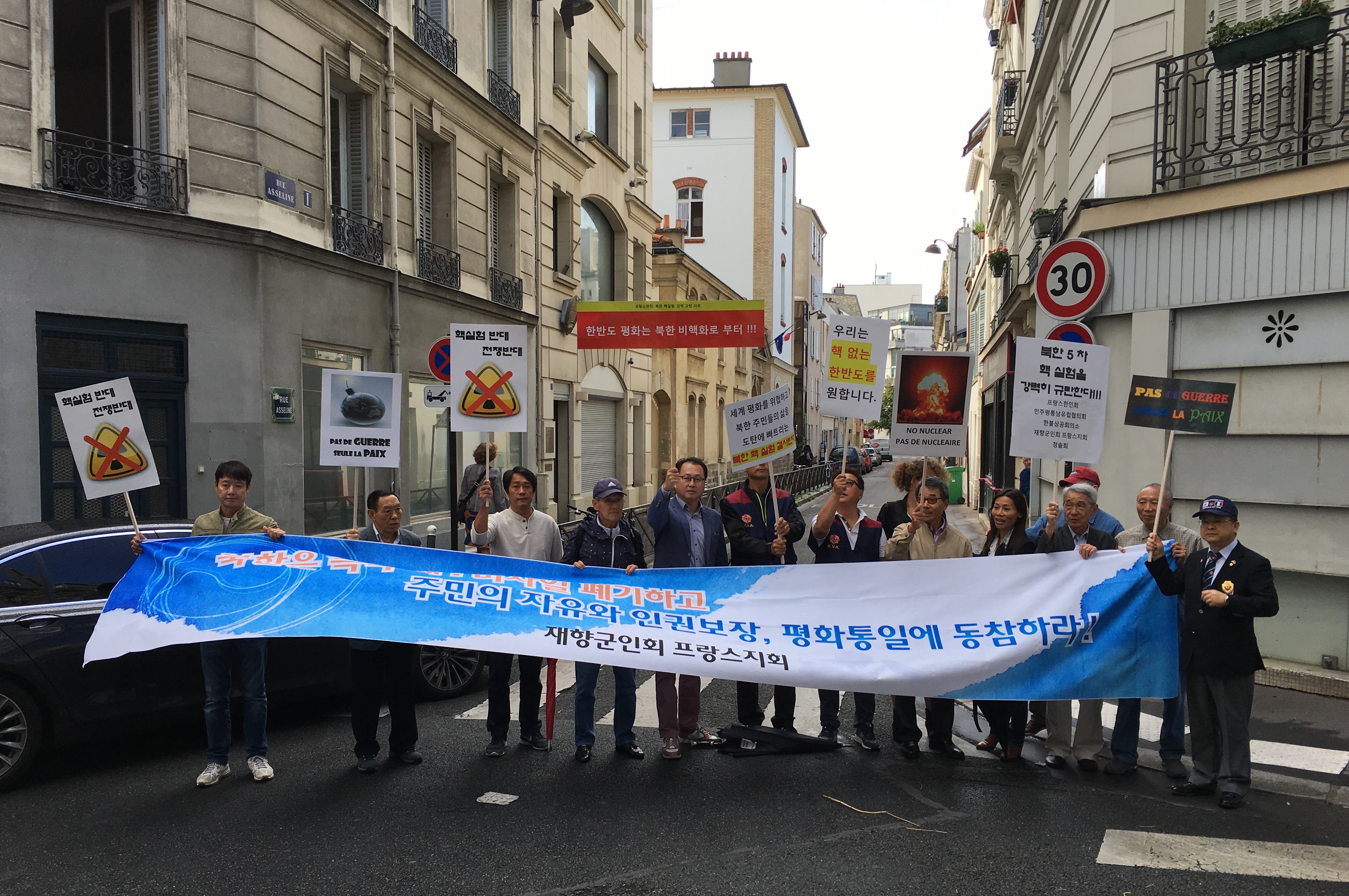 ‘북한은 즉각 핵, 미사일 폐기하고, 주민의 자유와 인권보장, 평화통일에 동참하라’, ‘민족 생존 위협하는 북한 핵, 미사일 도발, 국론결집으로 응징하자, ‘국론 결집으로 북핵폐기, 평화 통일 달성하자’, 등이 적힌 현수막과, ‘핵실험 반대 전쟁반대’, ‘한반도 평화는 북한 비핵화로부터’ ‘우리는 핵없는 한반도를 원합니다. ‘PAS DE GEURRE SEUl LAPAIX’ 등이 적힌 피켓을 들고 집회를 가졌다. 북한 대표부앞에서 나상원 재향군인회 프랑스지회 회장의 연설이 있었고, 이상무 프랑스 한인회 회장은 동포언론을 통해 발표한 북한의 제5차 핵실험에 대한 강력 규탄 성명서를 읽고, 세가지 사항을 외쳤다.